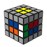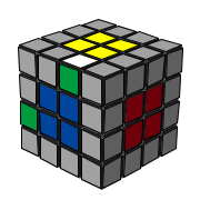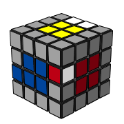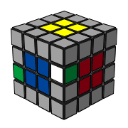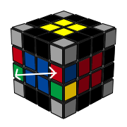 4. 從頂/底層找到一個未組合的邊塊移下來,這邊可以用 R U' R' 把藍白/紅白的邊移下來到白綠邊塊原本的位置。 |