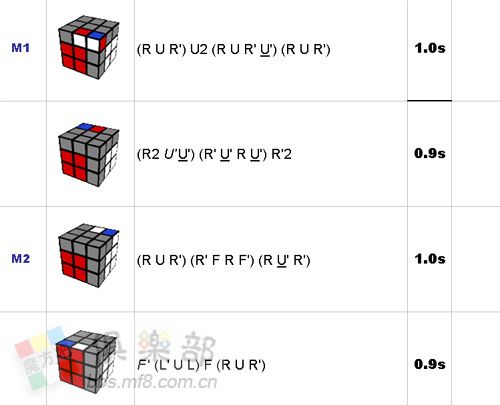 很早就發現有幾種F2L存在有兩個不錯的公式,結果我是選取多次測速平均最快的那個,而棄用另一公式。但最近在練習中經常用到下面這兩組公式,突然想到和OLL、 PLL是一個道理,每個頂層F2L(棱塊或角塊有一個在頂層)都有4種 狀態,那麼如果只掌握一個公式,必然有一個 狀態是要轉U2的,而有的公式開始需要換手,那這加起來就是很可觀的浪費。